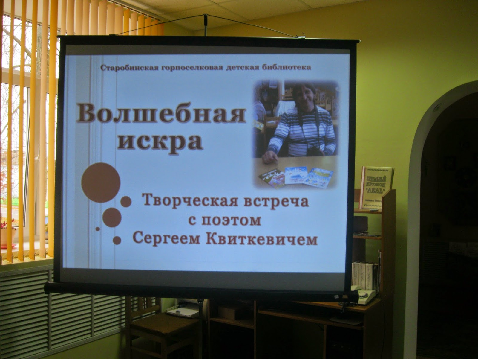 17 октября в Старобинской детской библиотеке прошла встреча учеников Старобинской средней школы с поэтом, журналистом и главным редактором газеты "Шахцёр" Сергеем Борисовичем Квиткевичем.
